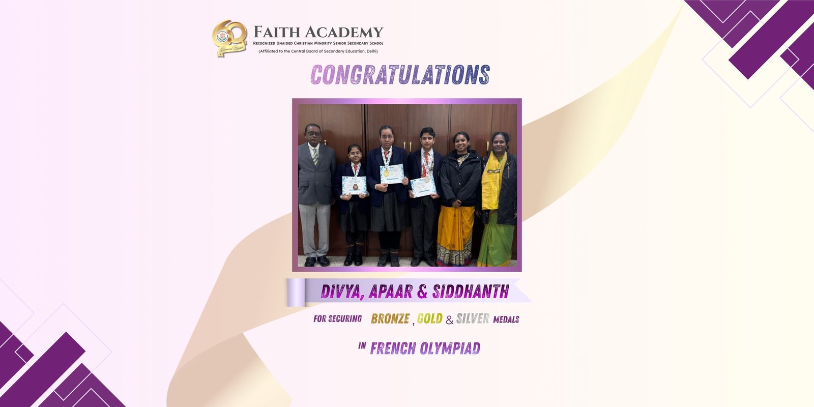The Christian Educational Society opened the doors of Faith Academy on January 8, 1964 as a primary school. From a small beginning of 15 students and 5 teachers the school has blossomed to a Senior Secondary School with more than 2,500 students. Mrs. Mary P. Dorsey was the first Principal and Mr. John L. Dorsey was the Manager of Faith Academy. The students are trained in the Word of God (Bible), and in linguistic, social and scientific disciplines, to be godly and responsible citizens of our great country India.